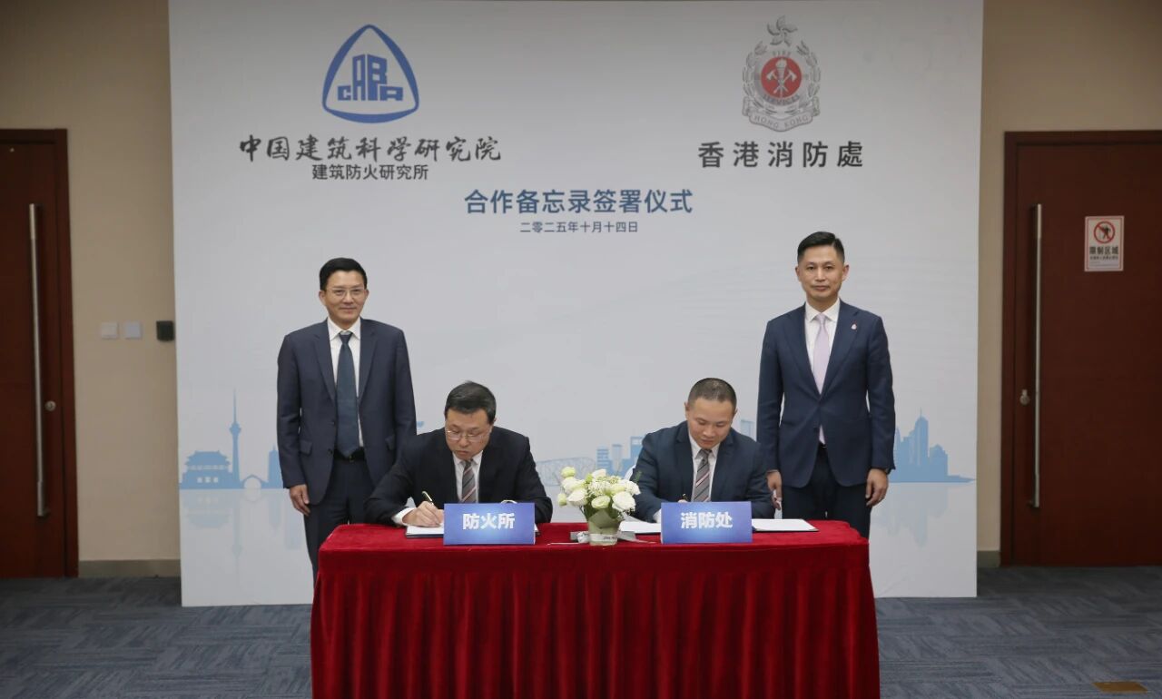 10月14日,中国建研院建筑防火研究所与香港特别行政区政府消防处(以下简称“香港消防处”)在北京举行合作备忘录签署仪式。中国建研院党委副书记、总经理樊金龙和香港消防处处长杨恩健共同见证签约,标志着双方在建筑防火安全领域的协作正式开启新篇章,将携手为两地乃至全球消防安全事业注入新动能。